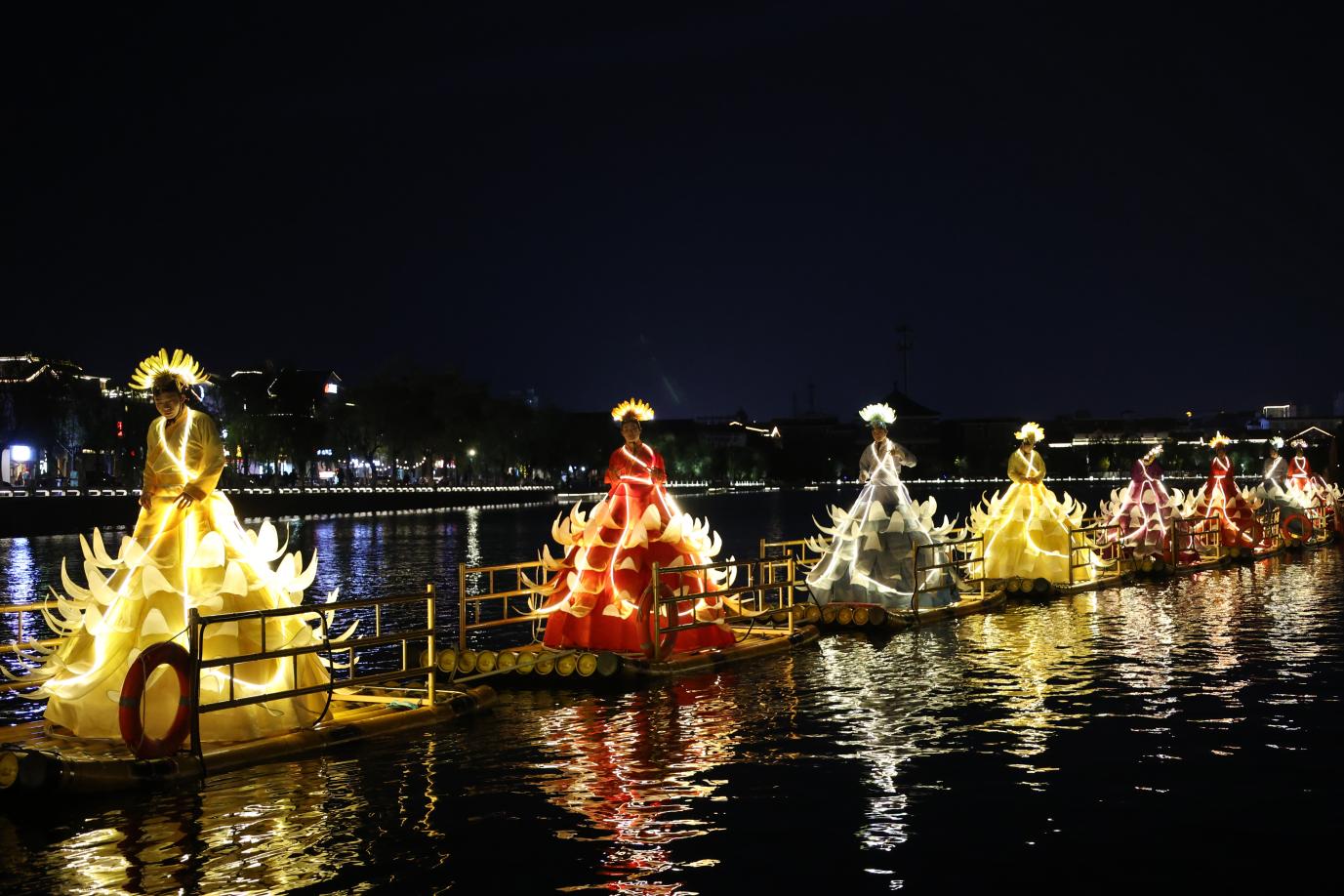 在分会场汴河游《桨声花影·寻梦汴梁》中,学子们身着“科技感”服饰化身“菊花仙子”,乘龙舟环游汴河,与沿岸游客进行热情互动,让游客们在桨声灯影中沉浸式感受“东京梦华”的市井烟火,其表现精准契合了学院“文化+旅游+科技”的交叉学科培养目标。
