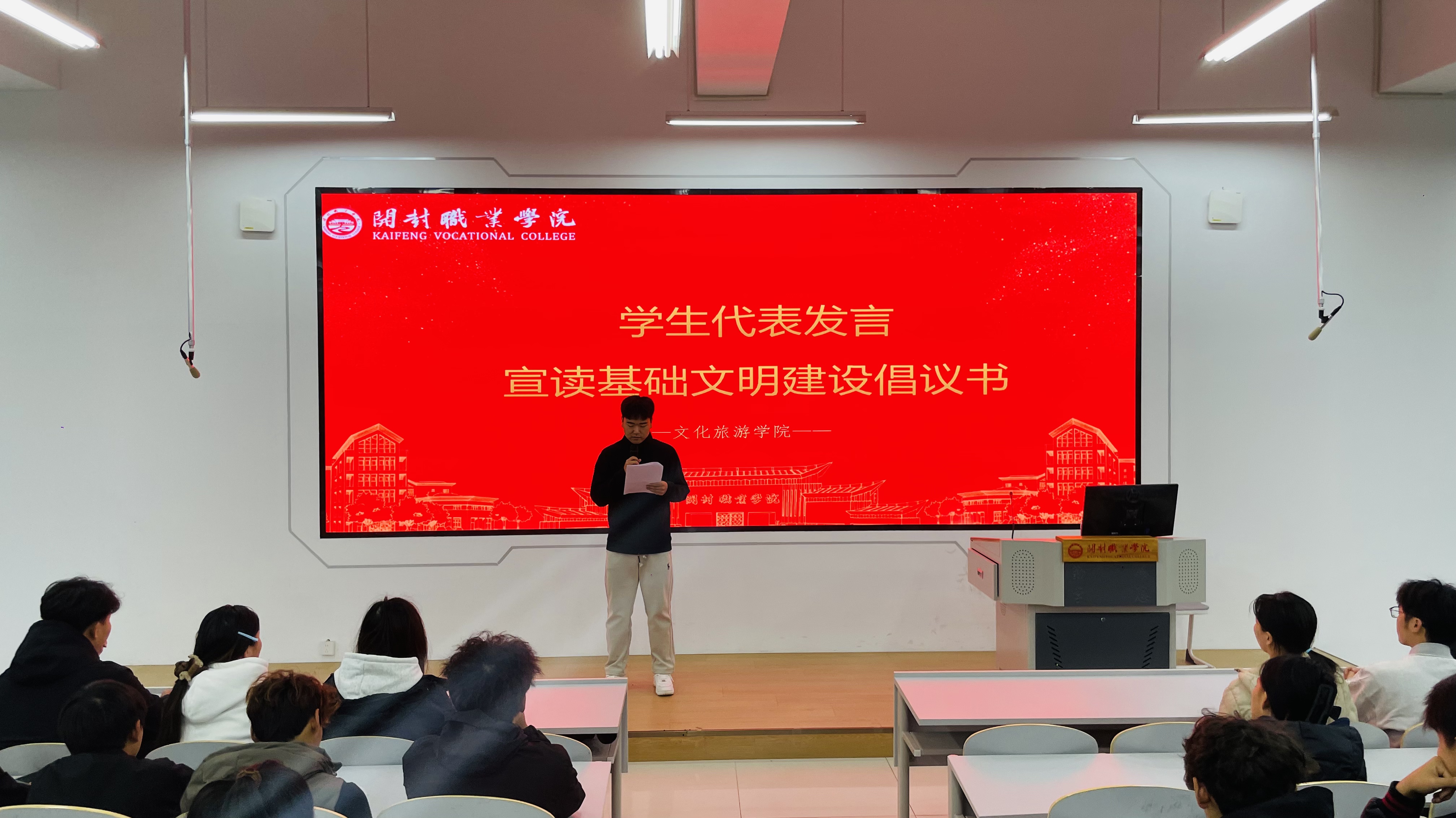 仪式伊始,文化旅游学院学生会副主席刘大鹏代表全体同学宣读《基础文明建设月倡议书》。号召同学们从行为文明、安全文明、宿舍文明、教室文明、网络文明、就餐文明等方面严格要求自己,以实际行动为文明校园建设贡献青春力量。倡议内容既贴合校园生活实际,又紧扣新时代大学生文明素养要求,引发在场师生强烈共鸣。