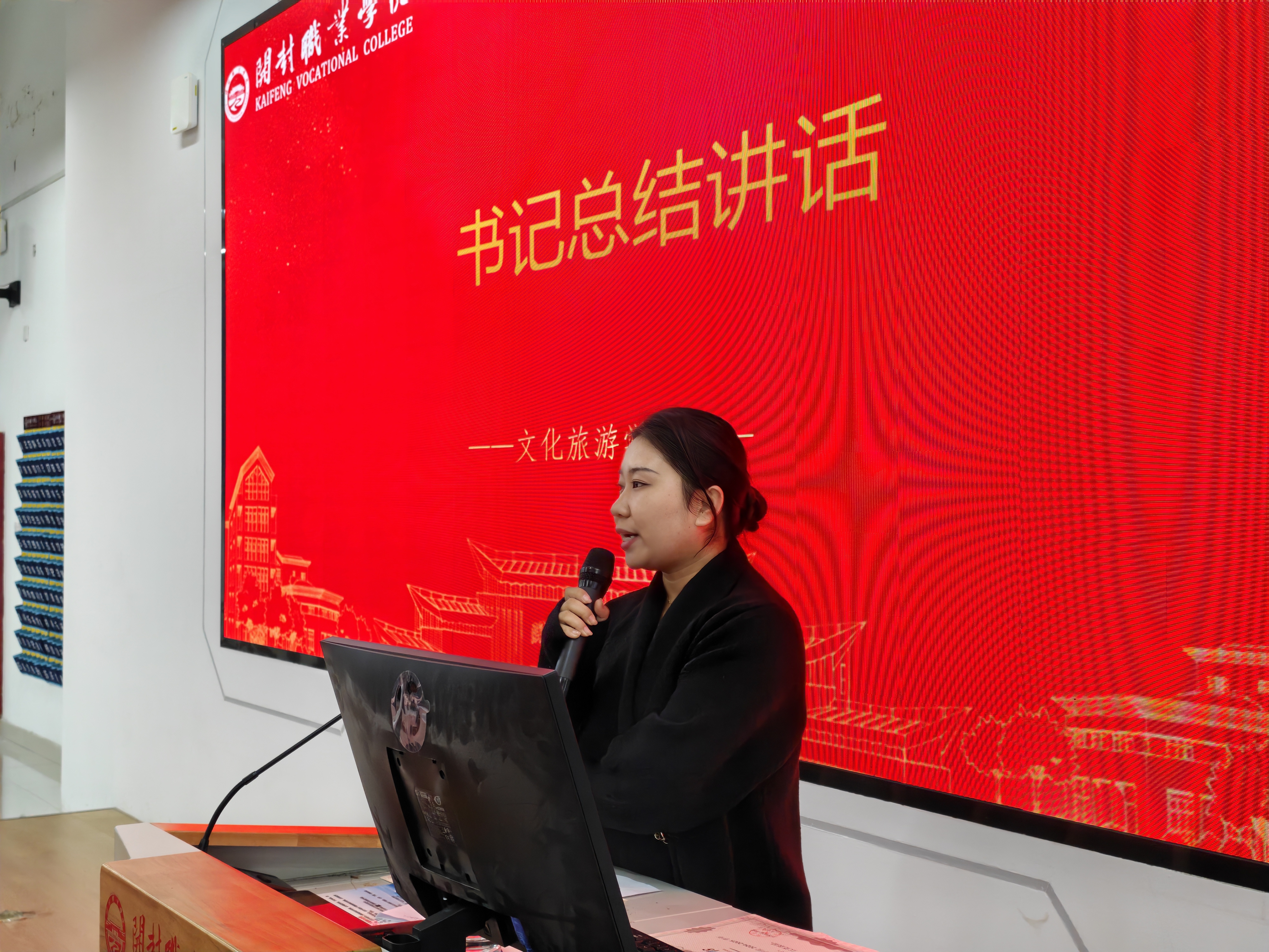 最后,杨雨晴书记作总结讲话。她指出基础文明是大学生成长成才的基石,不仅关乎个人品德修养,更影响校园文化建设与社会文明进步。本次“基础文明月”活动以“文明于心,礼行于身”为主题,正是希望同学们将文明意识内化于心、外化于行,从课堂礼仪、宿舍整理、日常言行等小事做起,逐步养成良好习惯。同时,杨雨晴书记动员全体文旅学子积极参与后续主题班会、文明宿舍建设、“最美书桌”评选、明礼课堂等系列活动,在实践中深化对文明的理解,共同营造“和谐、文明、向上”的学习生活环境。