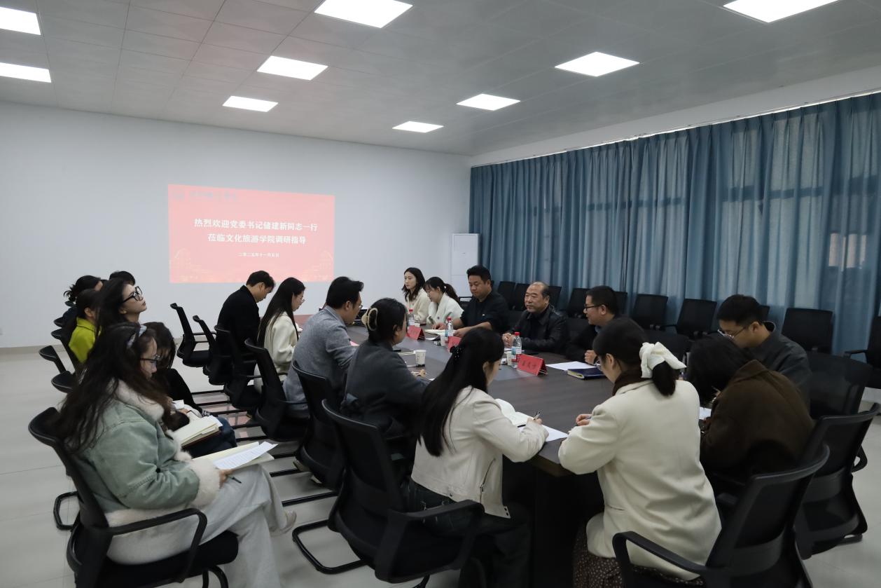 为深入学习贯彻习近平新时代中国特色社会主义思想和党的二十届四中全会精神,全面落实新时代党的建设总要求和新时代党的组织路线,进一步强化党建引领,推动学校事业高质量发展,11月5日下午,校党委书记储建新,党政办公室主任、宣传部部长王文方,学生工作部部长、武装部部长黄宏川一行,深入文化旅游学院调研并在明仲楼207会议室召开座谈会。文化旅游学院党总支书记、院长王松及全体教职工参加会议,会议由党政办公室主任、宣传部部长王文方主持会议。