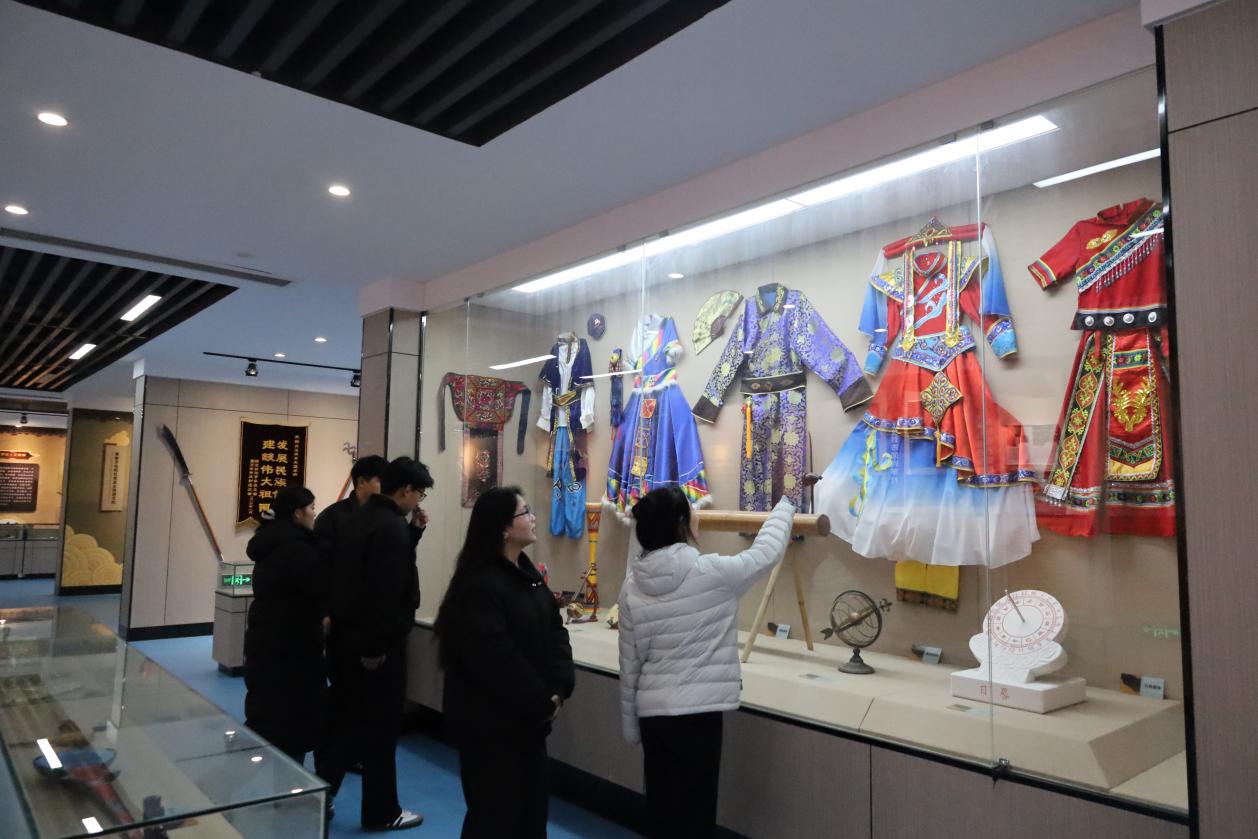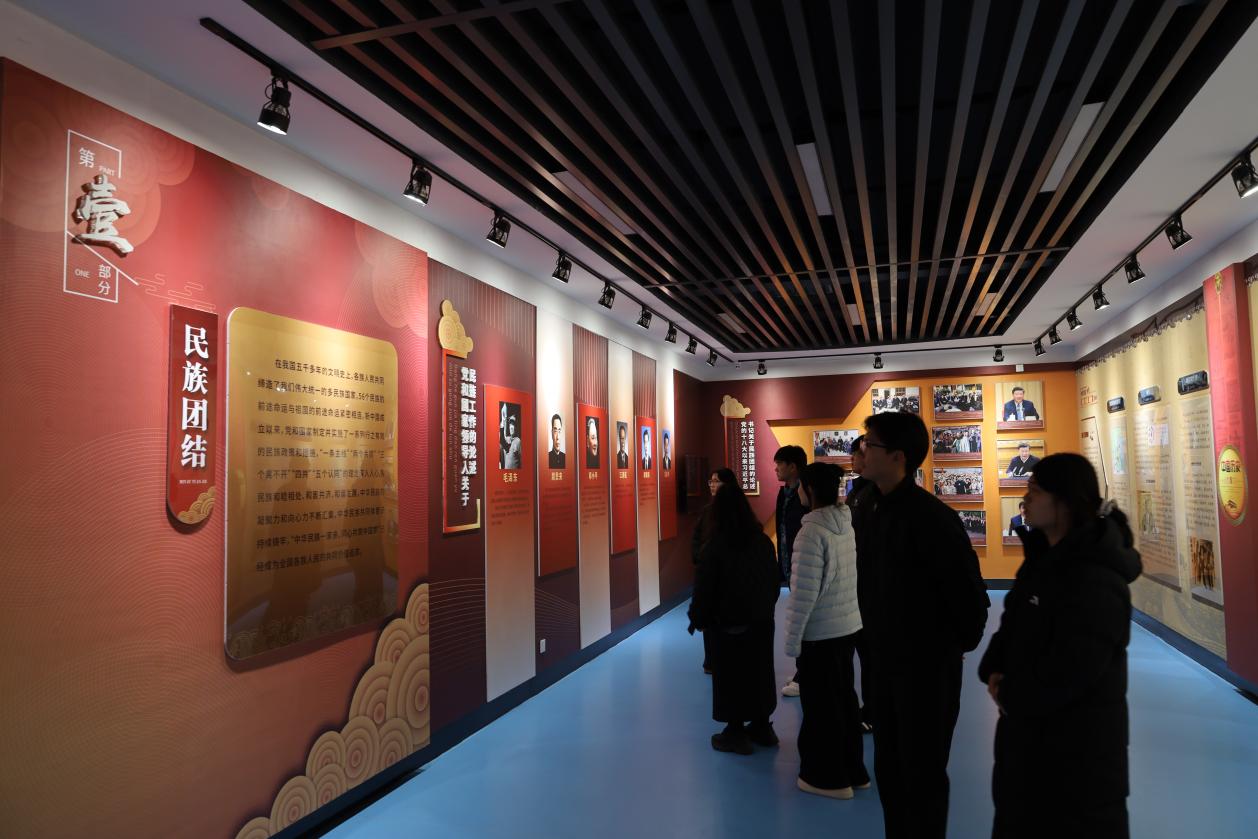 为深入学习贯彻习近平总书记关于加强和改进民族工作的重要思想,扎实推进铸牢中华民族共同体意识教育,引导青年学子树立正确的民族观,2025年12月11日下午,文化旅游学院学生党支部组织入党积极分子开展“石榴结籽心连心,民族团结一家亲”主题党日活动。在学生党支部书记杨雨晴的带领下,师生一行走进中华民族共同体展馆,开启了一场沉浸式的民族团结教育之旅。