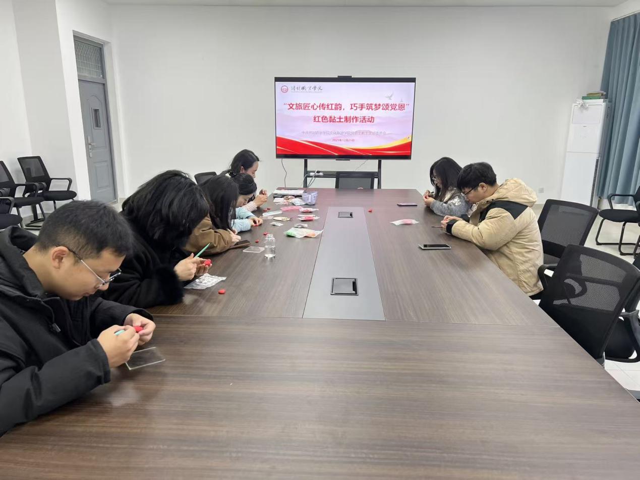 为深入推动红色文化育人工作走深走实,将立德树人根本任务融入教育教学全过程,12月25日上午,文化旅游学院教师党支部在明仲楼207会议室开展了以“文旅匠心传红韵,巧手筑梦颂党恩”的红色主题黏土制作活动。活动由王若燚老师现场指导,全体教师党员积极参与。