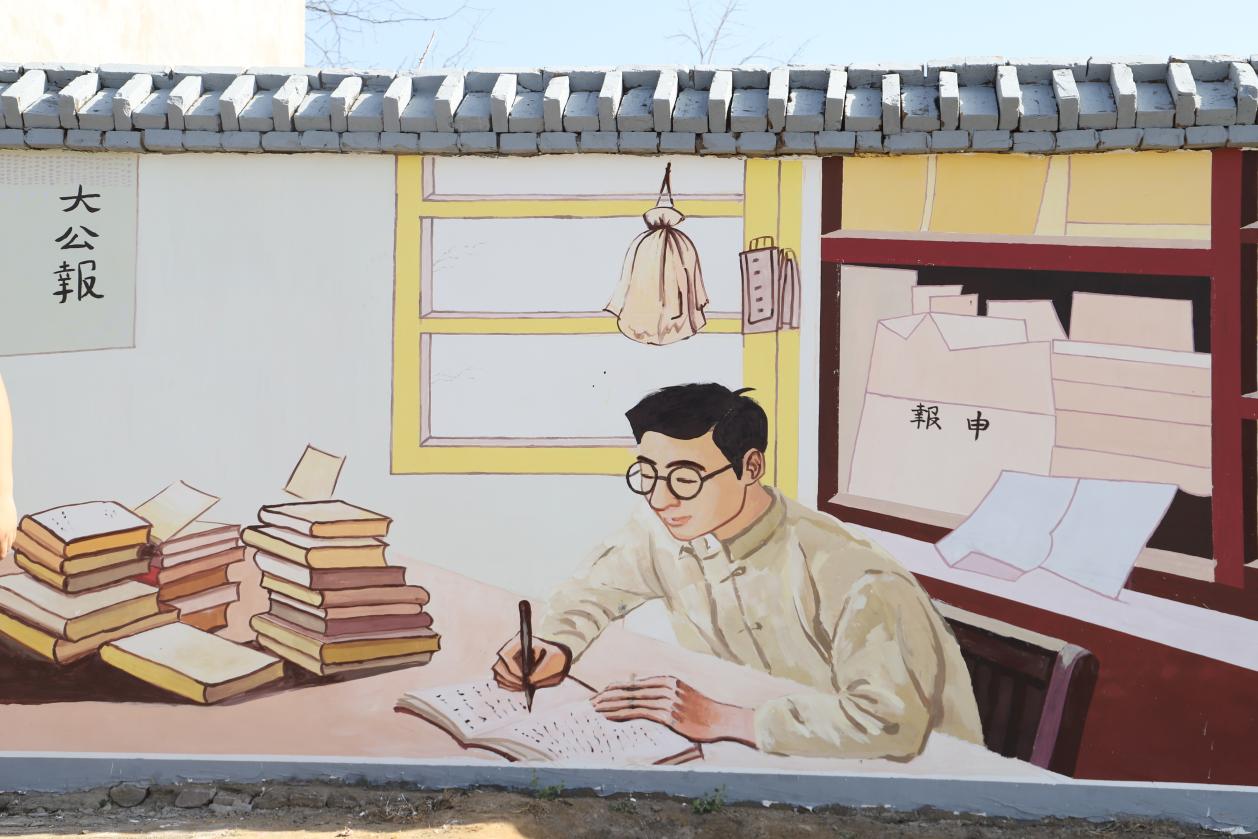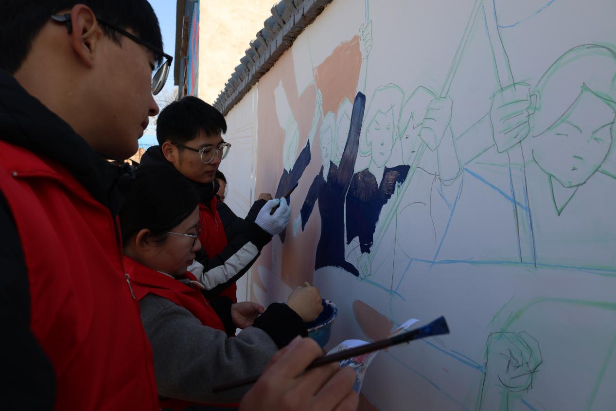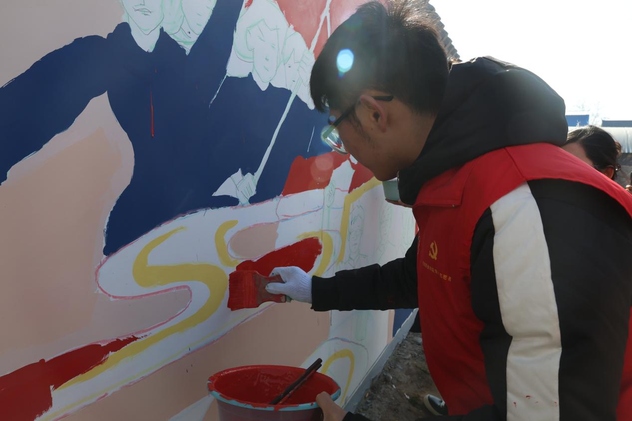 活动现场,师生团队以专业实力与责任担当,将红色故事绘于墙面、融于乡村。在刘禹君老师与李晗老师的专业指导下,教师党员带头攻坚,师生高效协作,严格把控每一道工序,将师陀先生“以文为刃”的革命精神通过生动画面具象呈现。