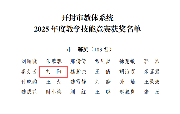 近日,开封市总工会、开封市教育体育局联合印发《关于开封市教体系统2025年度教学技能竞赛获奖情况的通报》(汴总发〔2025〕28号),我院青年教师刘阳凭借扎实的教学功底、创新的教学设计以及鲜明的教学特色,在全市众多参赛教师中脱颖而出,荣获“二等奖”。