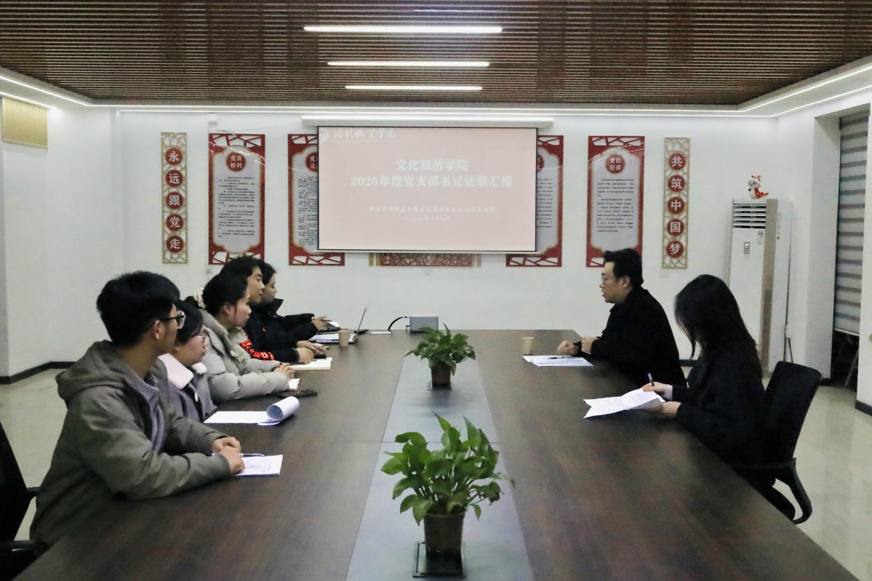 为压紧压实党建责任、推动基层党建提质增效,2026年1月9日下午,文化旅游学院党总支在7号楼119党建活动室召开2025年度党支部书记抓党建述职评议大会。学院党总支书记王松主持,教师党支部宣传委员孟俊琦、学生党支部书记杨雨晴述职,全体党员参会并评议。