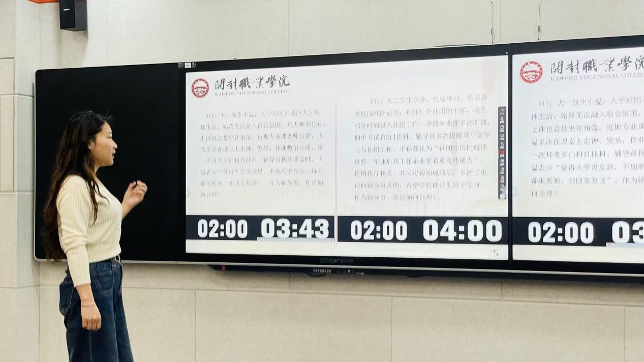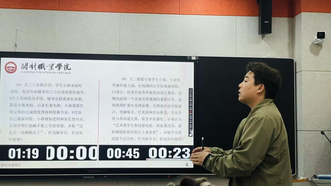 为进一步提升辅导员专业素养和业务能力,强化育人实效,搭建辅导员交流学习、切磋技艺的平台,2026年4月1日下午,文化旅游学院与数字经济学院联合举办的开封职业学院第二届辅导员素质能力大赛(院赛)案例研讨环节,在毕昇楼216智慧教室顺利开展。文化旅游学院团总支书记杨雨晴担任本次院赛评委,数字经济学院团总支书记连豪杰主持赛事,两院23级、24级、25级全体辅导员按分组有序参赛,展现出扎实的职业功底与良好的育人风采。