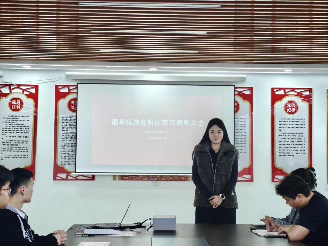 为总结实习成果、表彰先进典型,进一步深化产教融合育人成效,激励广大学生积极投身实践锻炼。2026年4月2日下午,文化旅游学院团总支在七号楼119党建活动室举行2024级实习表彰大会,表彰在郑州银基国际旅游度假区圆满完成实习并表现突出的学生。团总支书记杨雨晴、24级辅导员和思雅、张雨帅出席大会。