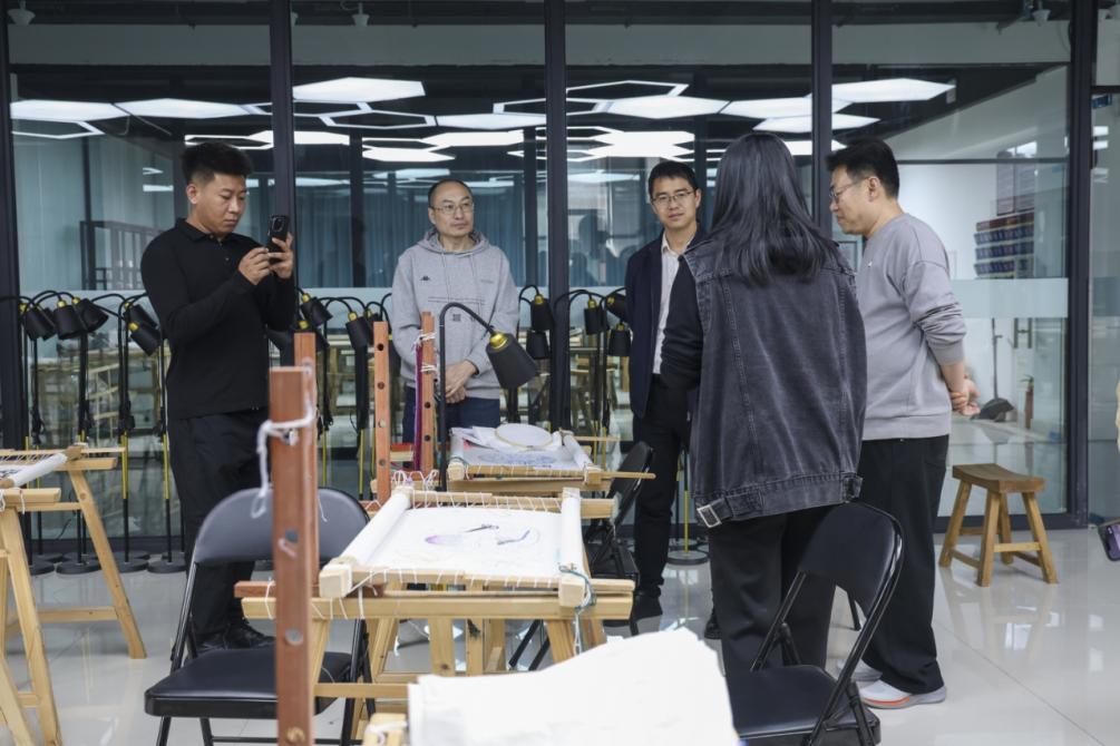考察第一站,文化旅游学院院长王松带领嘉宾参观实训基地,详细介绍学院专业建设与非遗传承成果。学院立足开封地域文化特色,重点打造汴绣、朱仙镇木板年画、北宋官瓷三大非遗课程。其中汴绣专业为全省高职独有,采用中国特色学徒制,聘请非遗传承人现场教学,同时计划引入AI设计、现代机绣等新技术,并与开封博物馆共建研发基地,开发文创产品,着力打造汴绣品牌IP,推动传统技艺实现产业化发展。在木板年画、官瓷教学上,学院完整还原传统工艺流程,建设专业工坊,让非遗技艺在现代职业教育中实现活态传承。